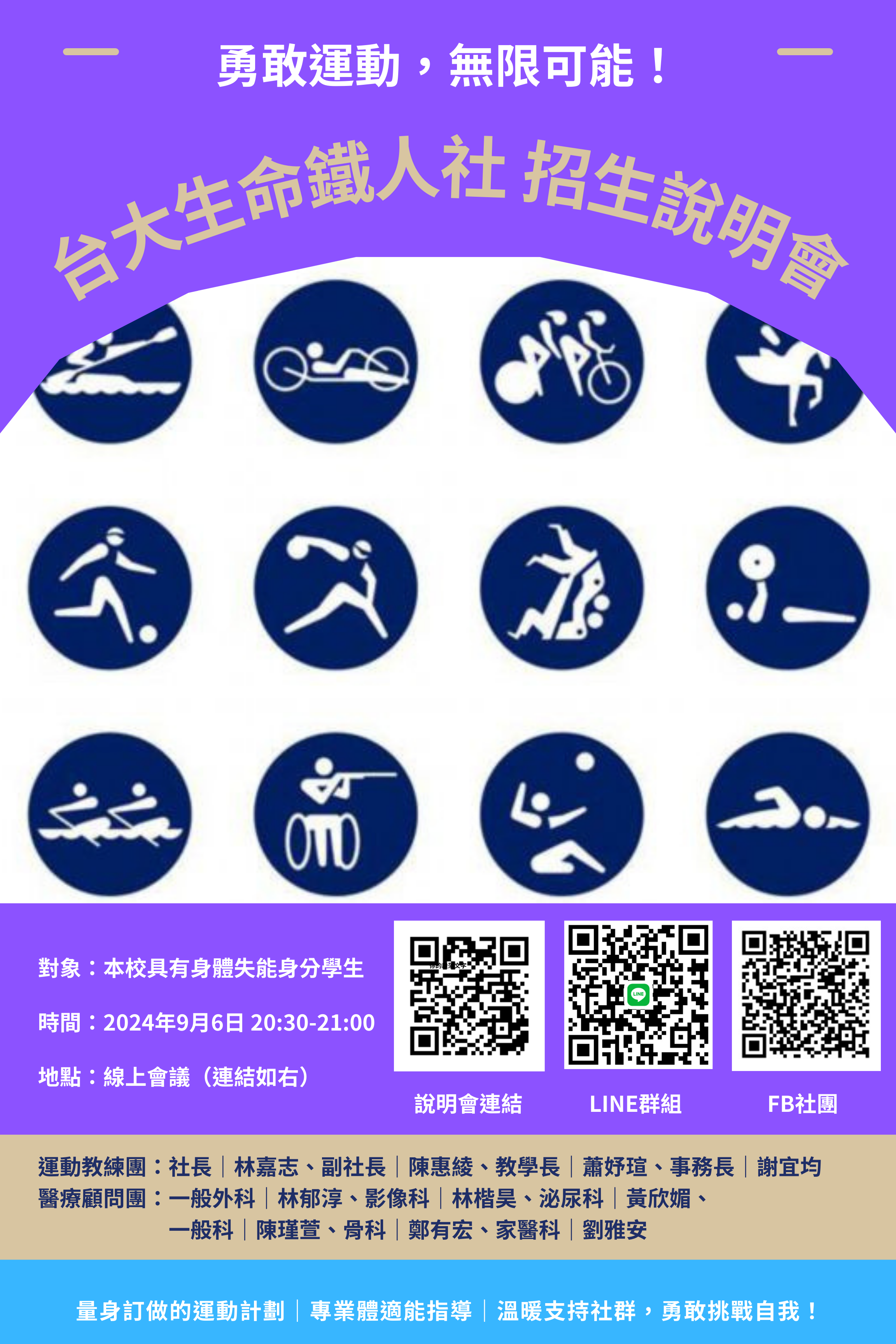 我們是一群具有專業和服務熱誠的小團隊,誠摯地邀請本校身障同學加入新成立的台大生命鐵人社。挑戰自我極限,打造更強大的身心!我們致力於透過系統化的肌力體能訓練,幫助社員提升基本與功能性肌力,建立自信,並養成正確的日常訓練習慣。不用擔心身體的不完美,只要你願意,生命鐵人社將為你提供專業的指導、個人化的訓練計劃及全方位的訓練器材,讓你激勵的環境中達到自己的目標。與一群志同道合的夥伴一起,迎接更健康、更強壯的自己!