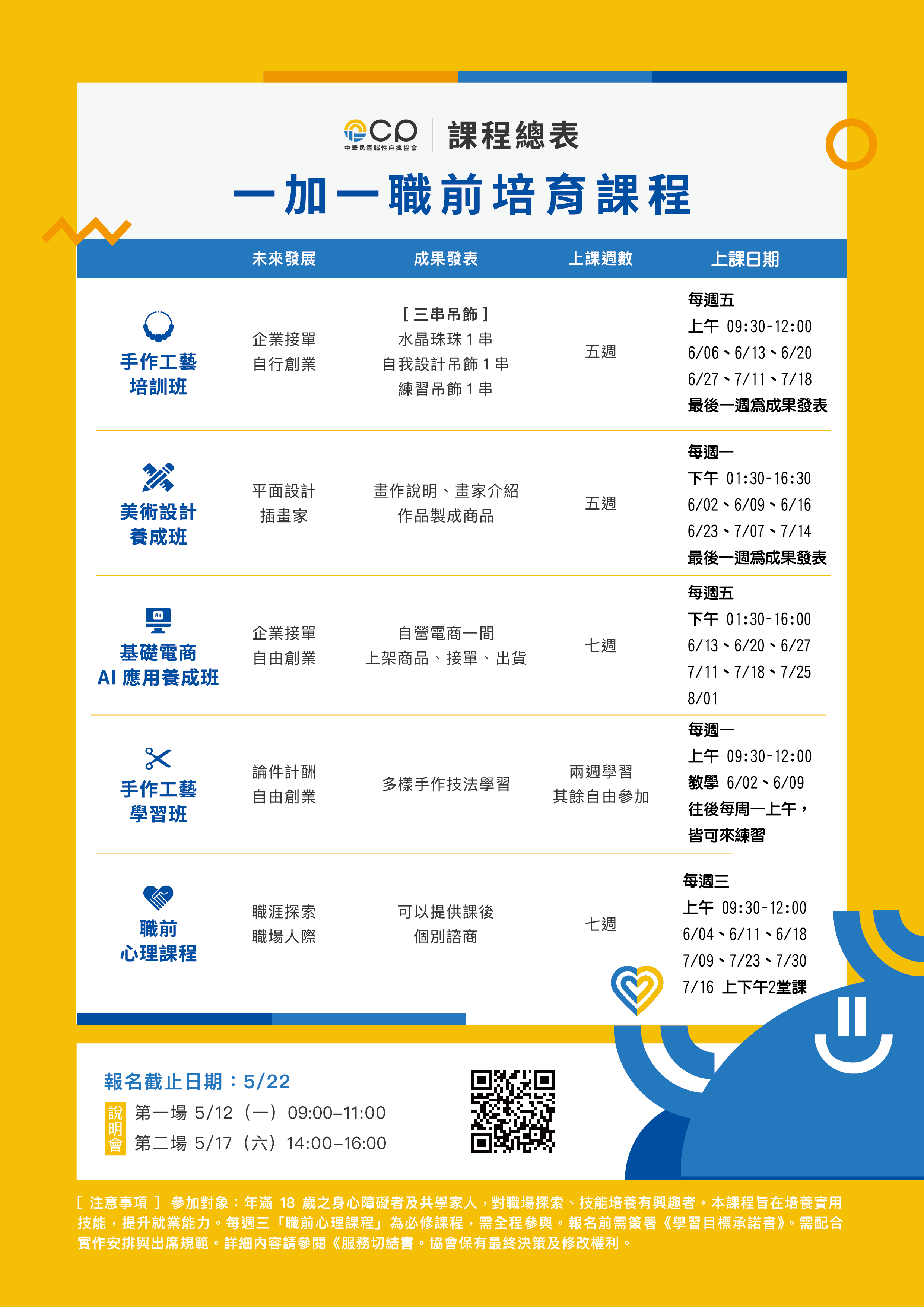 轉知-中華民國腦性麻痺協會 一加一職前培育課程 發佈日期:2025-05-16 00:00:00 (此為轉知訊息,請以主辦單位公告為準) 中華民國腦性麻痺協會辦理一加一職前培育課程 詳如附件~請自行參閱 瀏覽人次 353 一加一職前培育課程.png